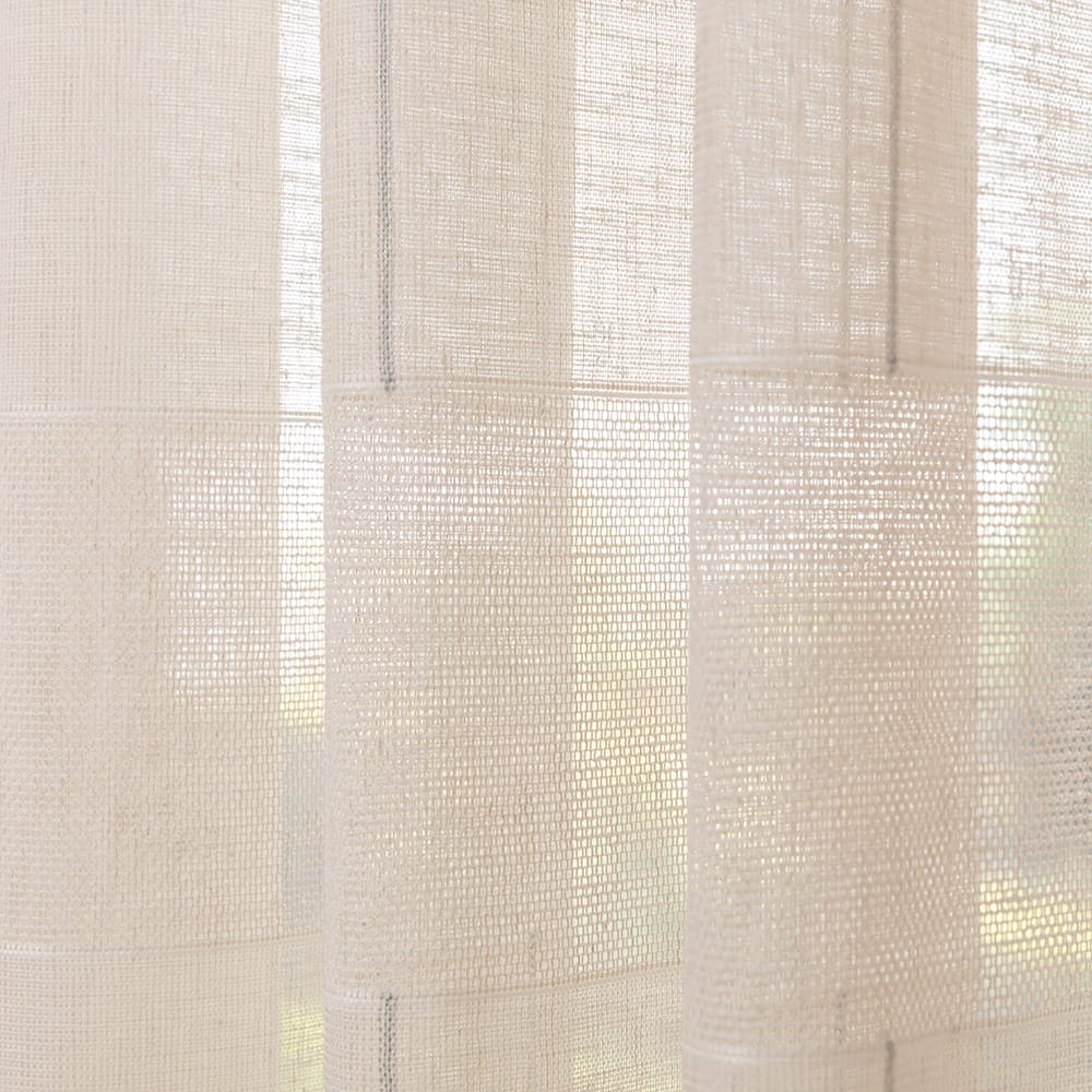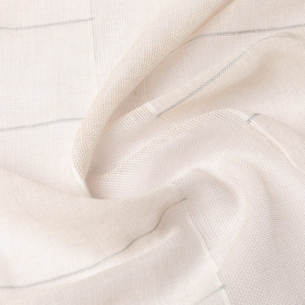 Vlamwerende geweven transparant in een natuurlijke linnenlook waarbij er vlakken in de stof ontstaan door de verschillende weeftechnieken met een subtiel ingeweven gekleurd streepje in de hoogte. Deze stof is kamerhoog zodat in de confectie geen naden zichtbaar zullen zijn. Aan de onderzijde van deze kamerhoge stof is een verzwaringskoord gemaakt, zodat deze prachtig valt en er geen zoom in hoeft. Deze stof is Oeko-Tex gecertificeerd.