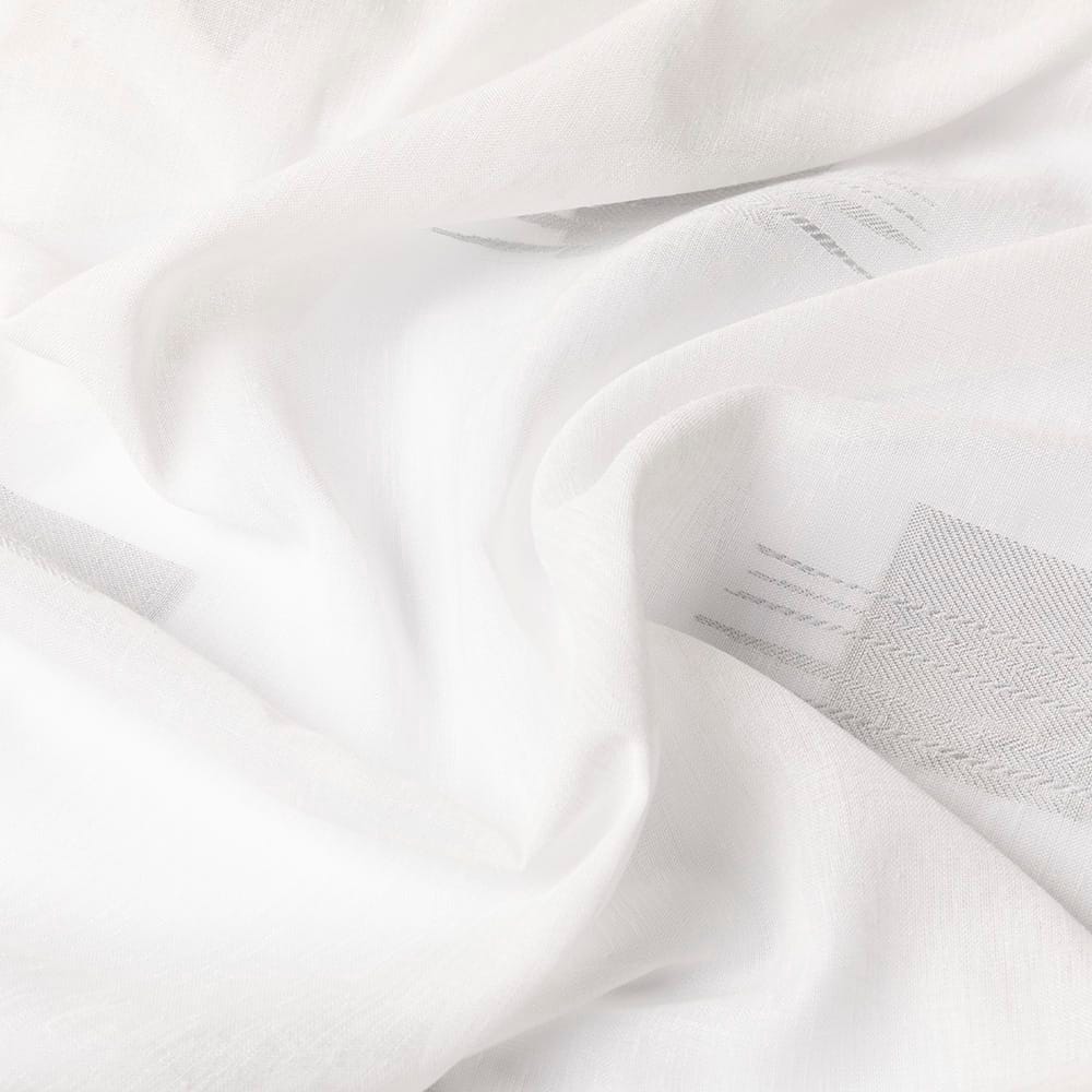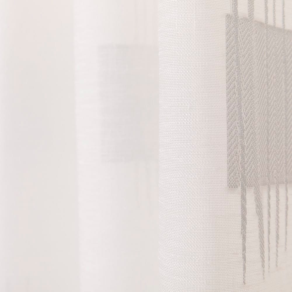 Vlamwerende decoratieve, soepel hangende, geweven transparant met een patroon van ingeweven vierkantje blokjes met onregelmatige streepjes. De stof is deels gemaakt van gerecycled polyester, afkomstig van petflessen. Deze stof is kamerhoog zodat in de confectie geen naden zichtbaar zullen zijn. Aan de onderzijde van de stof is een verzwaringskoord gemaakt, zodat deze prachtig valt en er geen zoom in hoeft. Deze stof is Oeko-Tex gecertificeerd.
