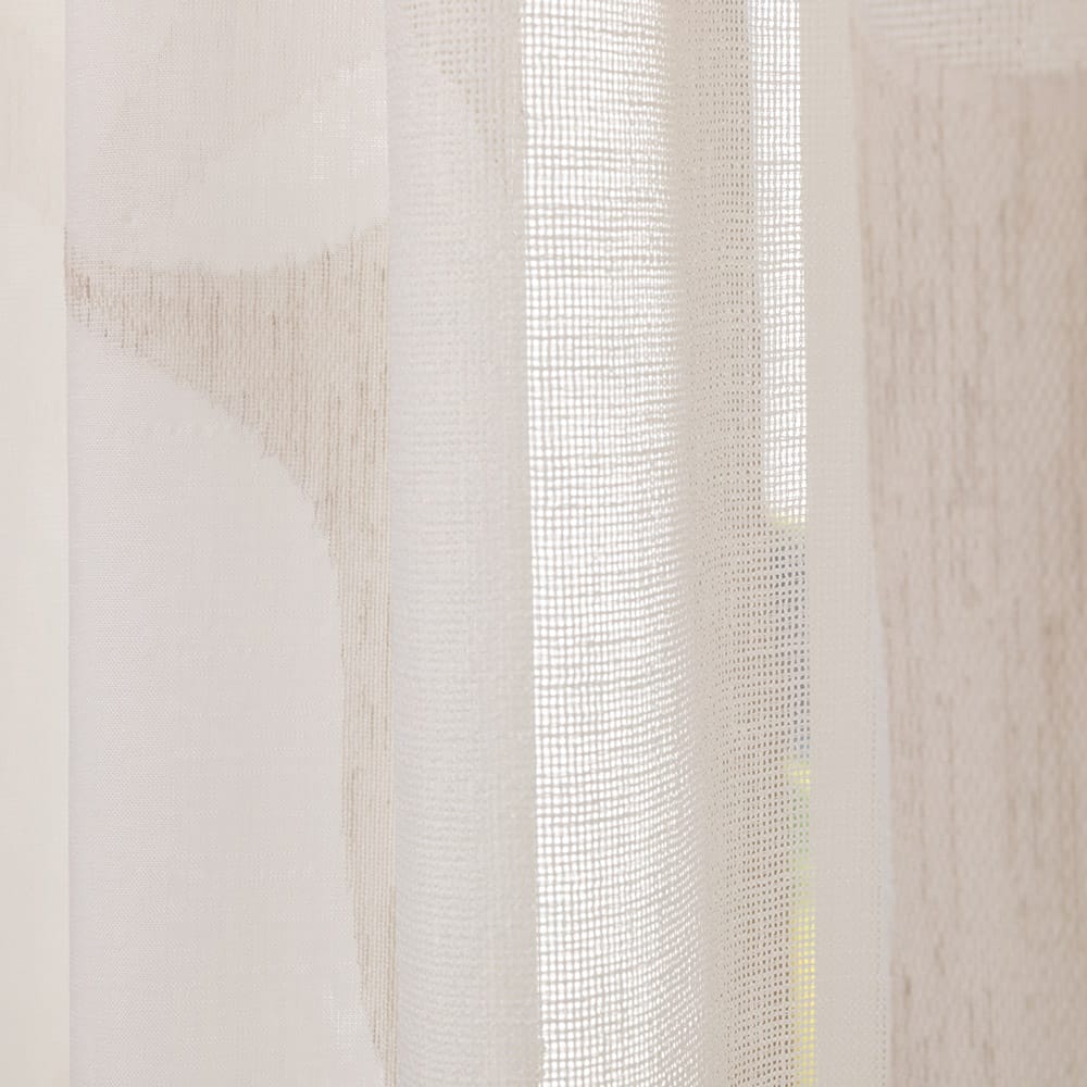 Deze transparante stof is deels open, en deels fijn geweven. Dit, in combinatie met het organische patroon, geeft de stof een spannende uitstraling. De stof is extra hoog en heeft aan de onderkant een verzwaringskoord waardoor het zonder naden geconfectioneerd kan worden en mooi valt.